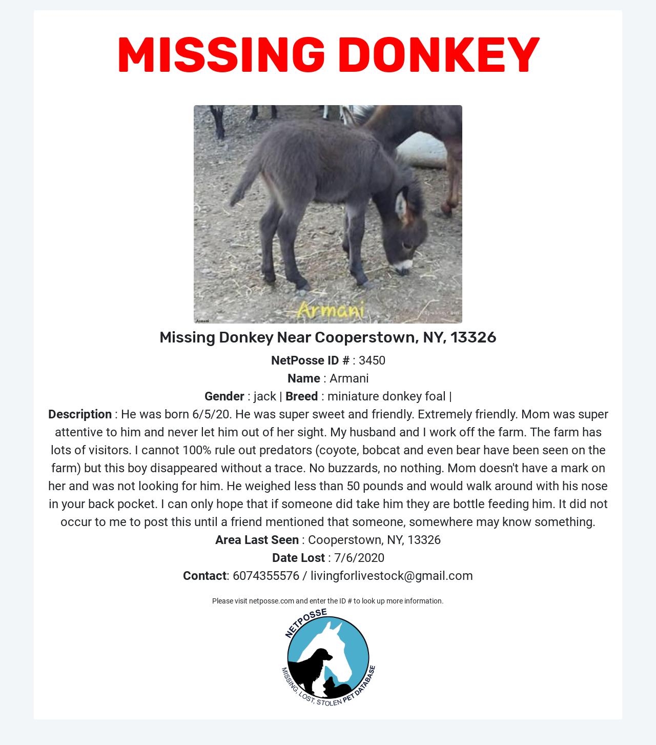 Description: He was born 6/5/20. He was super sweet and friendly. Extremely friendly. Mom was super attentive to him and never let him out of her sight. My husband and I work off the farm. The farm has lots of visitors. I cannot 100% rule out predators (coyote, bobcat and even bear have been seen on the farm) but this boy disappeared without a trace. No buzzards, no nothing. Mom doesn't have a mark on her and was not looking for him. He weighed less than 50 pounds and would walk around with his nose in your back pocket. I can only hope that if someone did take him they are bottle feeding him. It did not occur to me to post this until a friend mentioned that someone, somewhere may know something.
