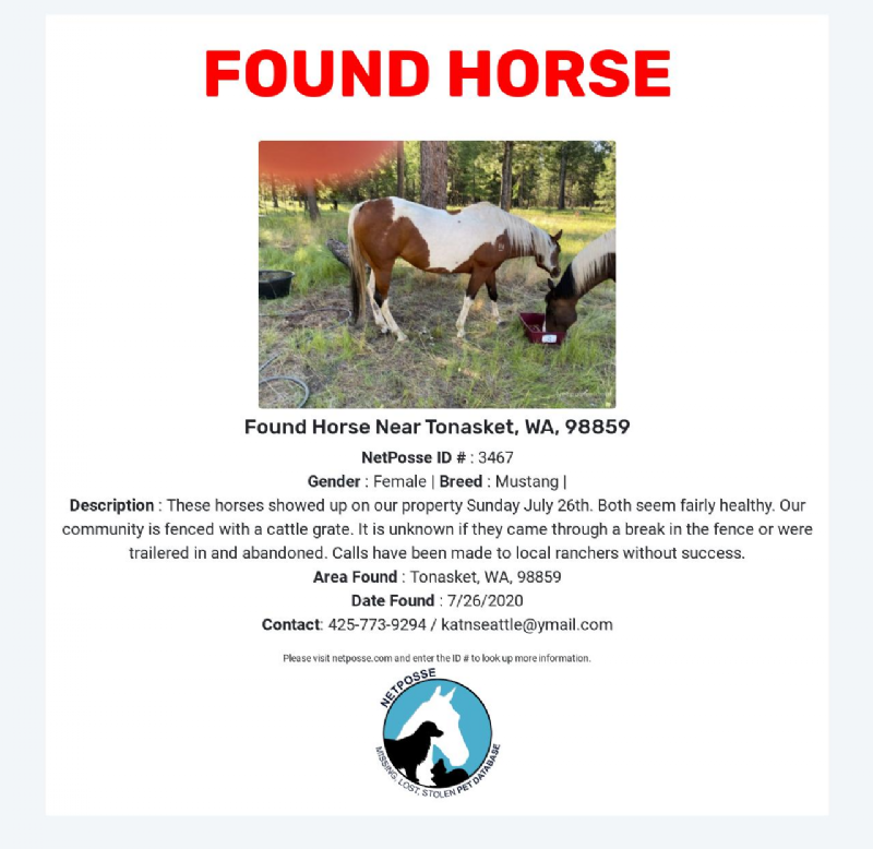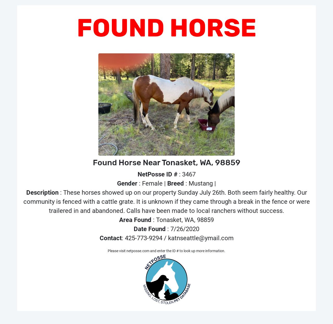 Description: These horses showed up on our property Sunday July 26th. Both seem fairly healthy. Our community is fenced with a cattle grate. It is unknown if they came through a break in the fence or were trailered in and abandoned. Calls have been made to local ranchers without success.