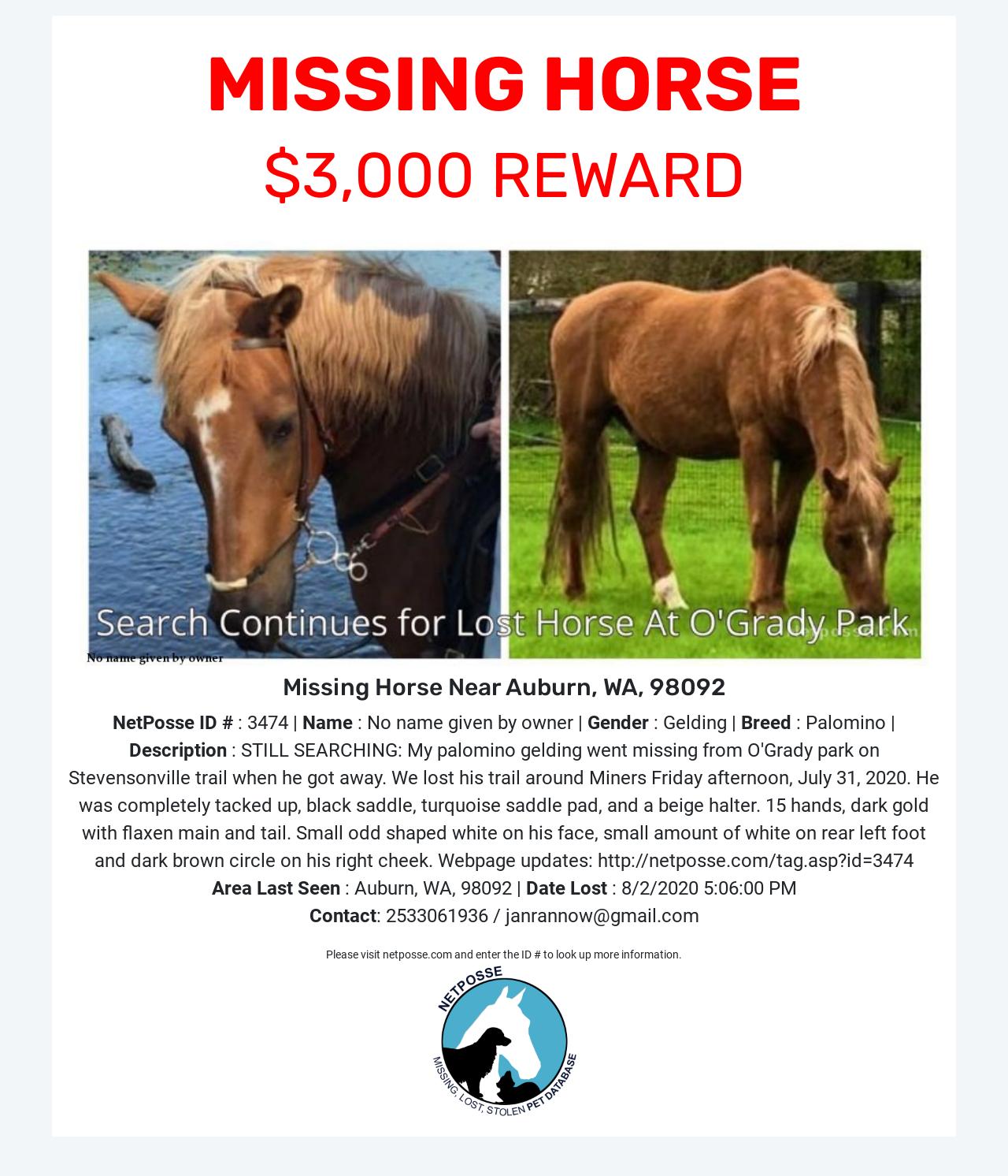 Description: My palomino gelding went missing from O'Grady park on Stevensonville trail when he got away. We lost his trail around Miners Friday afternoon, July 31, 2020. He was completely tacked up, black saddle, turquoise saddle pad, and a beige halter. Missing/stolen Palomino gelding. 15 hands, dark gold with flaxen main and tail. Small odd shaped white on his face, small amount of white on rear left foot and dark brown circle on his right cheek .Last seen near Auburn, WA Contact authorities and Jan 253-306-1936 janrannow@gmail.com Please keep an eye out for him. MISSING Horse - Auburn, WA 98092 - REWARD, http://netposse.com/tag.asp?id=3474