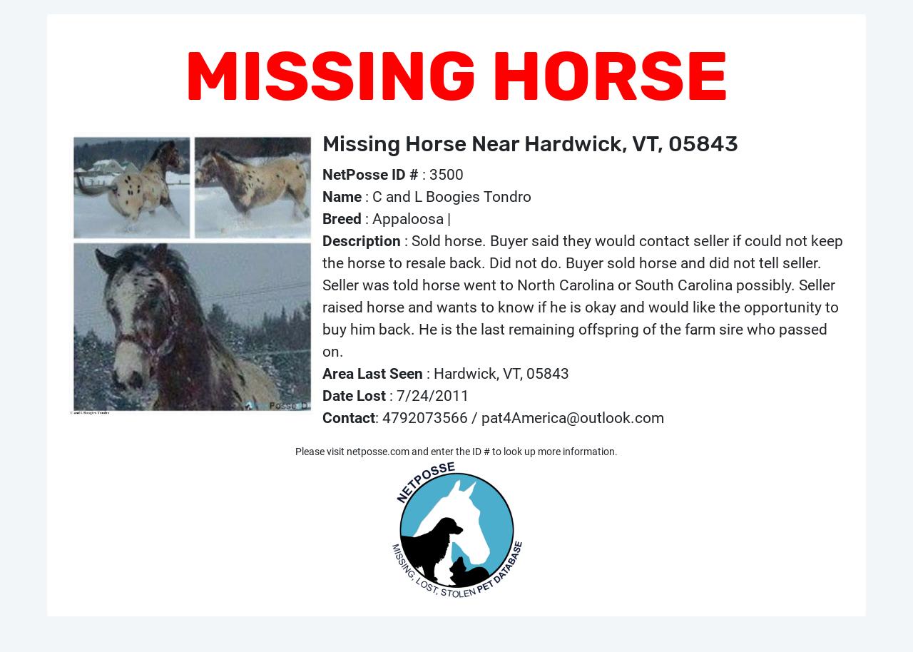Description: Sold horse. Buyer said they would contact seller if could not keep the horse to resale back. Did not do. Buyer sold horse and did not tell seller. Seller was told horse went to North Carolina or South Carolina possibly. Seller raised horse and wants to know if he is okay and would like the opportunity to buy him back. He is the last remaining offspring of the farm sire who passed on.