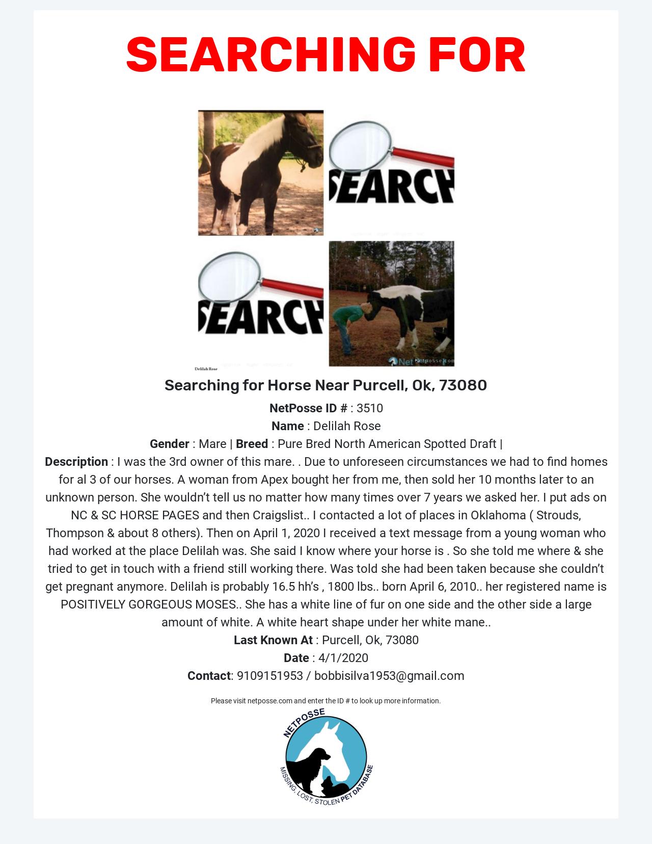 Description: I was the 3rd owner of this mare. . Due to unforeseen circumstances we had to find homes for al 3 of our horses. A woman from Apex bought her from me, then sold her 10 months later to an unknown person. She wouldn’t tell us no matter how many times over 7 years we asked her. I put ads on NC & SC HORSE PAGES and then Craigslist.. I contacted a lot of places in Oklahoma ( Strouds, Thompson & about 8 others). Then on April 1, 2020 I received a text message from a young woman who had worked at the place Delilah was. She said I know where your horse is . So she told me where & she tried to get in touch with a friend still working there. Was told she had been taken because she couldn’t get pregnant anymore. Delilah is probably 16.5 hh’s , 1800 lbs.. born April 6, 2010.. her registered name is POSITIVELY GORGEOUS MOSES.. She has a white line of fur on one side and the other side a large amount of white. A white heart shape under her white mane..