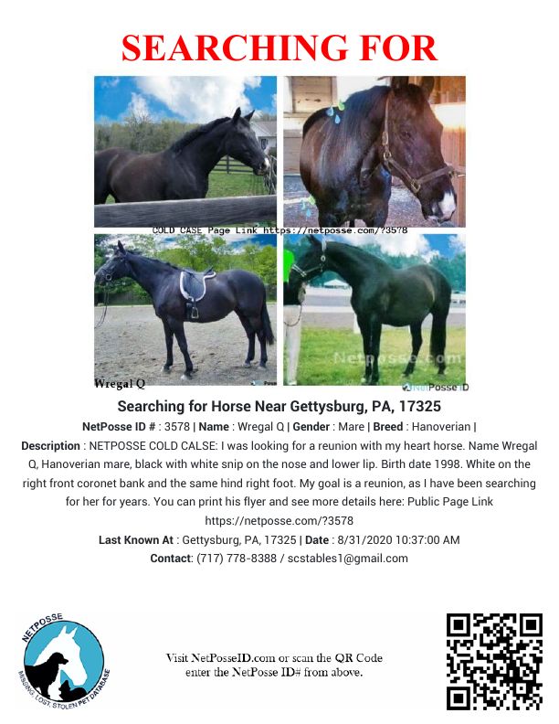 Description: I am looking for a reunion with my heart horse. Wregal Q, Hanoverian mare, black with white snip on the nose and lower lip. Birth date 1998. White on right front coronet band and the same hind right foot. Last seen on a property in Gettysburg, PA. So far, no cooperation. Have you seen Wregal? My goal is a reunion, as I have been searching for him for years.