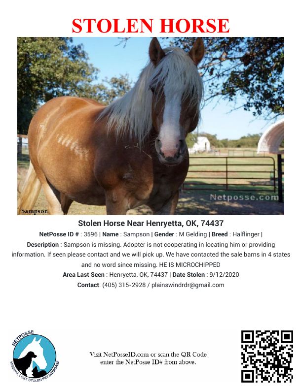 Description: ADOPTER IS NOT COOPERATING IN RECOVERING THE HORSE OR PROVIDING INFORMATION. Adopter "said" she came home from out of town to cut fences and horses missing. She is avoiding calls and we are worried about where he is. If seen please contact and we will pick up. We have contacted the sale barns in 4 states and no word since missing.