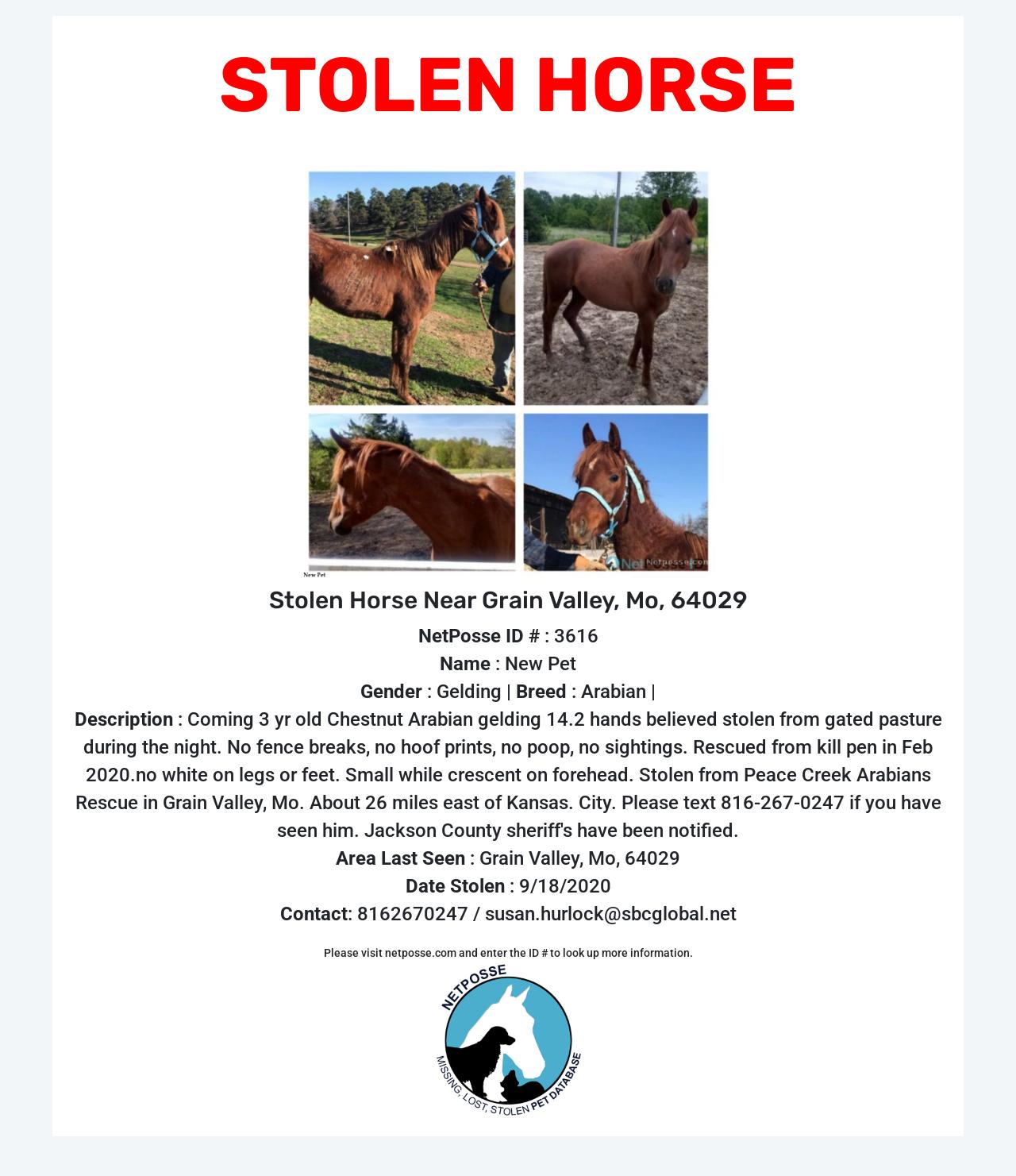 Description: Coming 3 yr old Chestnut Arabian gelding 14.2 hands believed stolen from gated pasture during the night. No fence breaks, no hoof prints, no poop, no sightings. Rescued from kill pen in Feb 2020.no white on legs or feet. Small while crescent on forehead. Stolen from Peace Creek Arabians Rescue in Grain Valley, Mo. About 26 miles east of Kansas. City. Please text 816-267-0247 if you have seen him. Jackson County sheriff's have been notified.