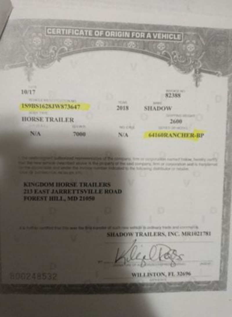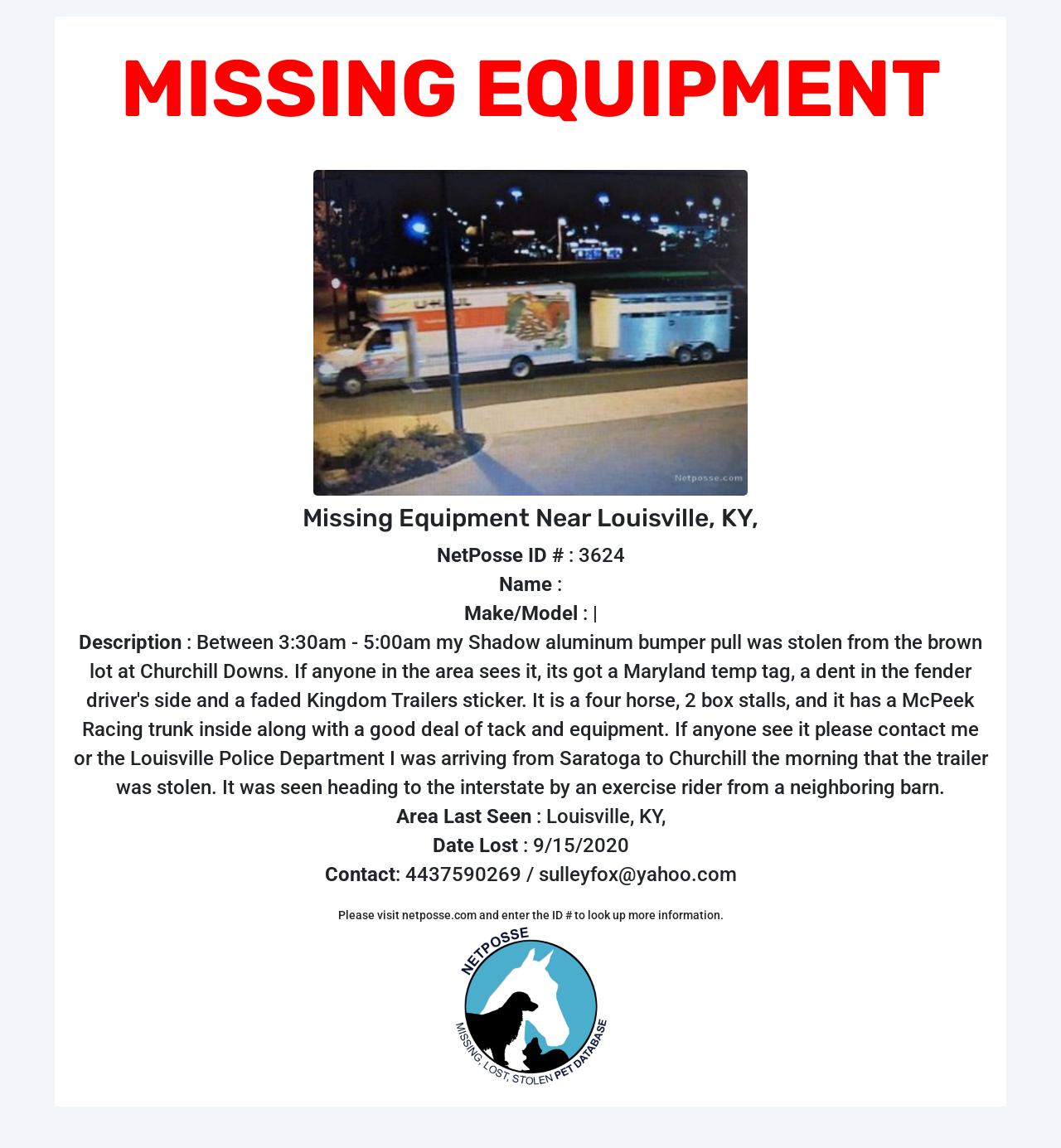 Description: Between 3:30am - 5:00am my Shadow aluminum bumper pull was stolen from the brown lot at Churchill Downs. If anyone in the area sees it, its got a Maryland temp tag, a dent in the fender driver's side and a faded Kingdom Trailers sticker. It is a four horse, 2 box stalls, and it has a McPeek Racing trunk inside along with a good deal of tack and equipment. If anyone see it please contact me or the Louisville Police Department I was arriving from Saratoga to Churchill the morning that the trailer was stolen. It was seen heading to the interstate by an exercise rider from a neighboring barn.