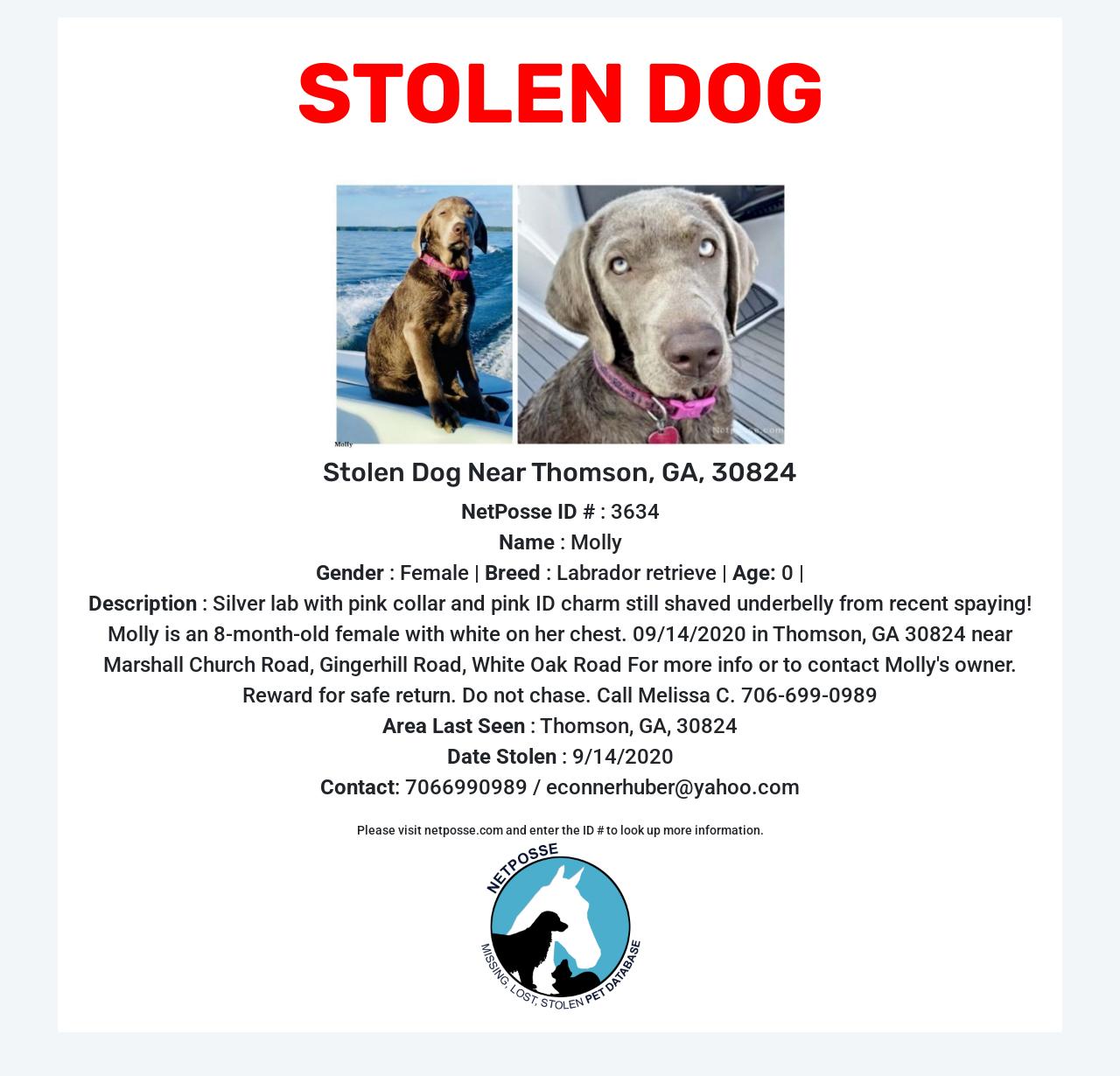 For more info or to contact Molly's owner. Reward for safe return. Do not chase. Call Melissa C. 706-699-0989