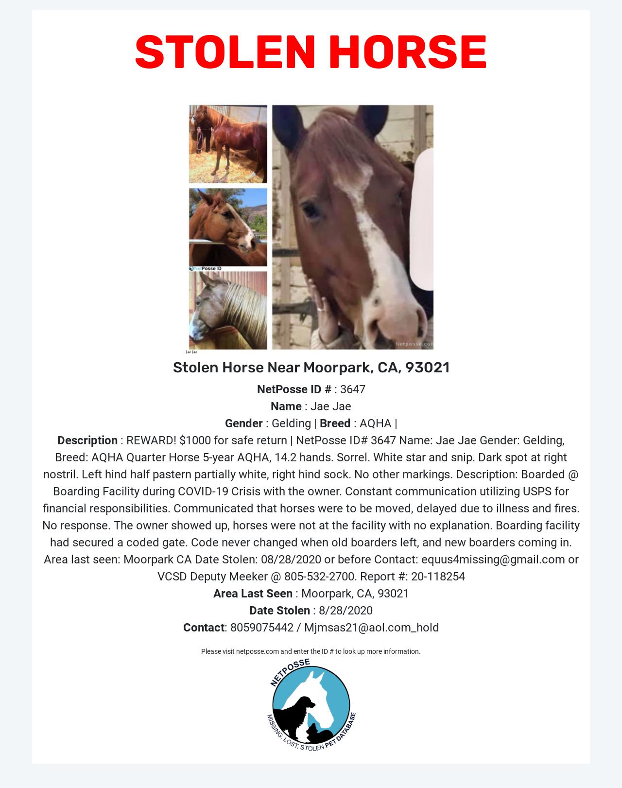 Contact: equus4missing@gmail.com or VCSD Deputy Meeker @ 805-532-2700. Report #: 20-118254