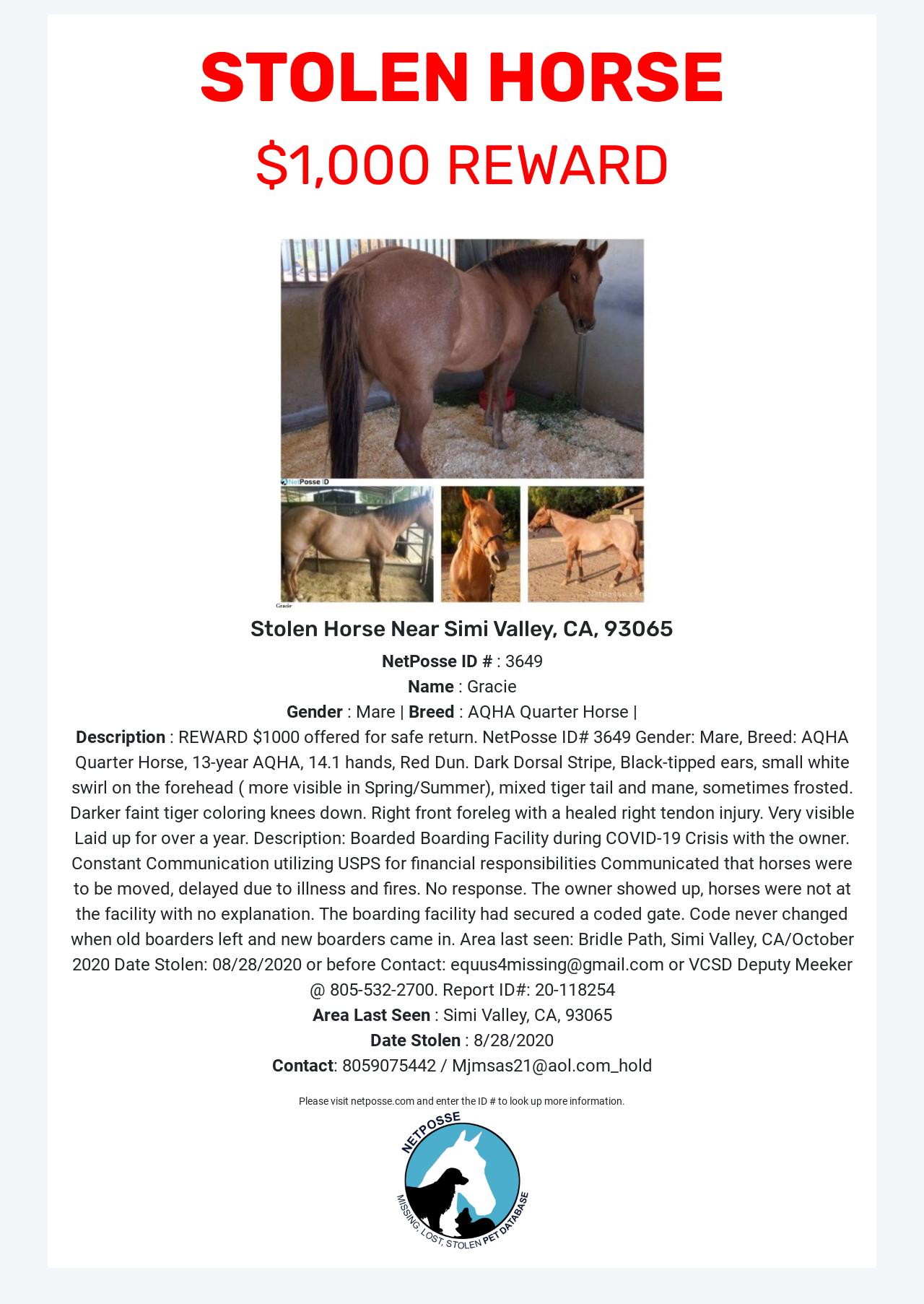 Contact: equus4missing@gmail.com or VCSD Deputy Meeker @ 805-532-2700. Report ID#: 20-118254