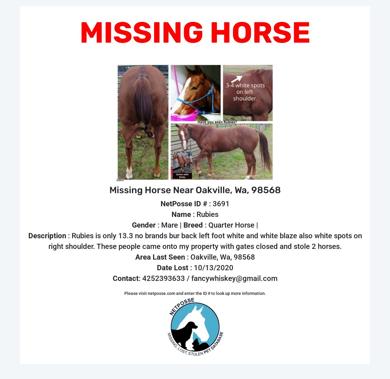 Description: Rubies is only 13.3 no brands bur back left foot white and white blaze also white spots on right shoulder. These people came onto my property with gates closed and stole 2 horses.