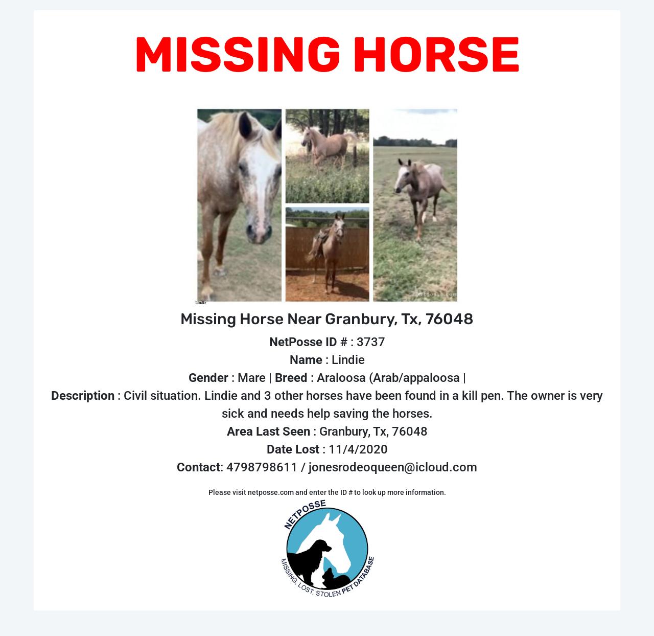 Description: Civil situation. Lindie and 3 other horses have been found in a kill pen. The owner is very sick and needs help saving the horses.