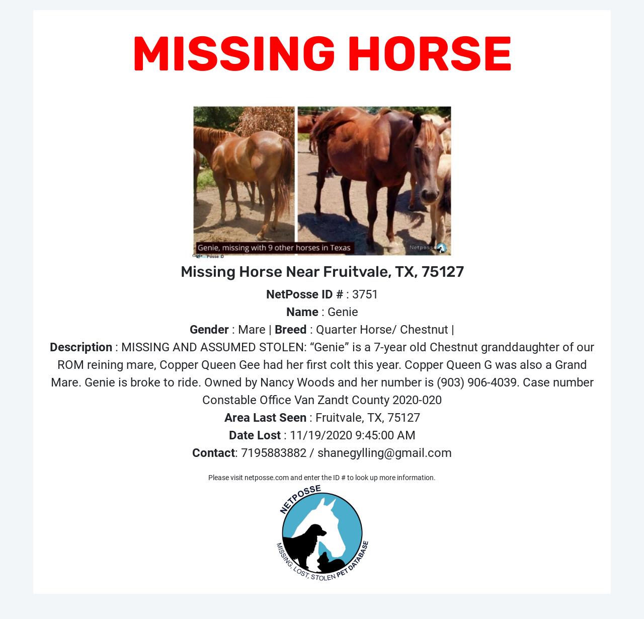 Description: MISSING AND ASSUMED STOLEN: “Genie” is a 7-year old Chestnut granddaughter of our ROM reining mare, Copper Queen Gee had her first colt this year. Copper Queen G was also a Grand Mare. Genie is broke to ride. Owned by Nancy Woods and her number is (903) 906-4039. Case number Constable Office Van Zandt County 2020-020