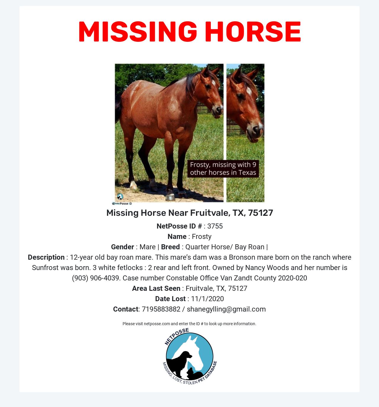 Description: 12-year old bay roan mare. This mare’s dam was a Bronson mare born on the ranch where Sunfrost was born. 3 white fetlocks : 2 rear and left front. Owned by Nancy Woods and her number is (903) 906-4039. Case number Constable Office Van Zandt County 2020-020