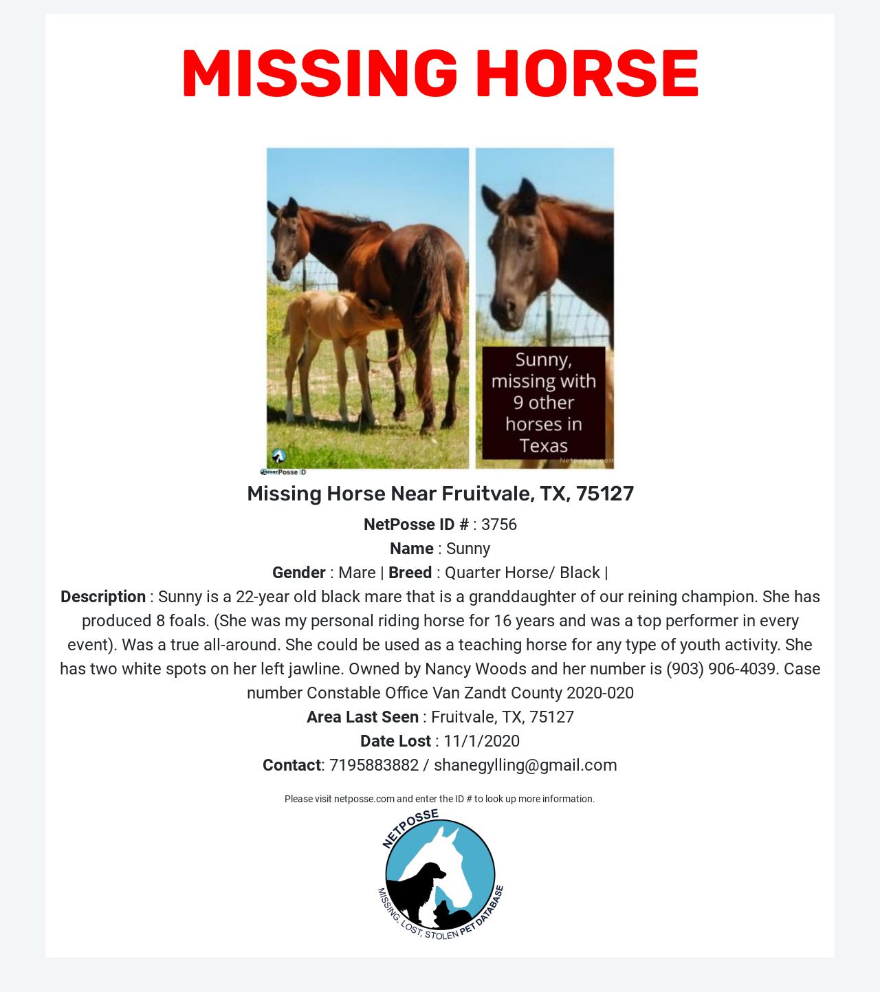 Description: Sunny is a 22-year old black mare that is a granddaughter of our reining champion. She has produced 8 foals. (She was my personal riding horse for 16 years and was a top performer in every event). Was a true all-around. She could be used as a teaching horse for any type of youth activity. She has two white spots on her left jawline. Owned by Nancy Woods and her number is (903) 906-4039. Case number Constable Office Van Zandt County 2020-020