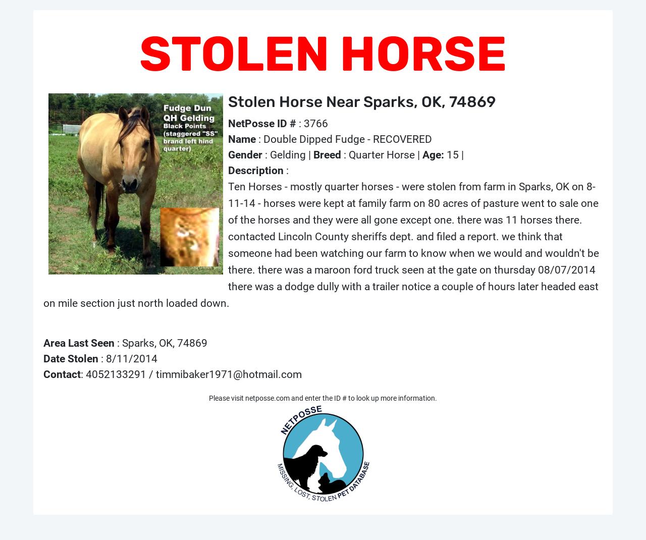 Description: Ten Horses - mostly quarter horses - were stolen from farm in Sparks, OK on 8-11-14 - horses were kept at family farm on 80 acres of pasture went to sale one of the horses and they were all gone except one. there was 11 horses there. contacted Lincoln County sheriffs dept. and filed a report. we think that someone had been watching our farm to know when we would and wouldn't be there. there was a maroon ford truck seen at the gate on thursday 08/07/2014 there was a dodge dully with a trailer notice a couple of hours later headed east on mile section just north loaded down.