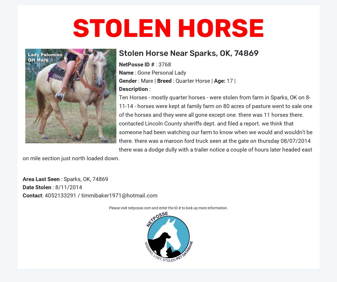 Description: Ten Horses - mostly quarter horses - were stolen from farm in Sparks, OK on 8-11-14 - horses were kept at family farm on 80 acres of pasture went to sale one of the horses and they were all gone except one. there was 11 horses there. contacted Lincoln County sheriffs dept. and filed a report. we think that someone had been watching our farm to know when we would and wouldn't be there. there was a maroon ford truck seen at the gate on thursday 08/07/2014 there was a dodge dully with a trailer notice a couple of hours later headed east on mile section just north loaded down.
