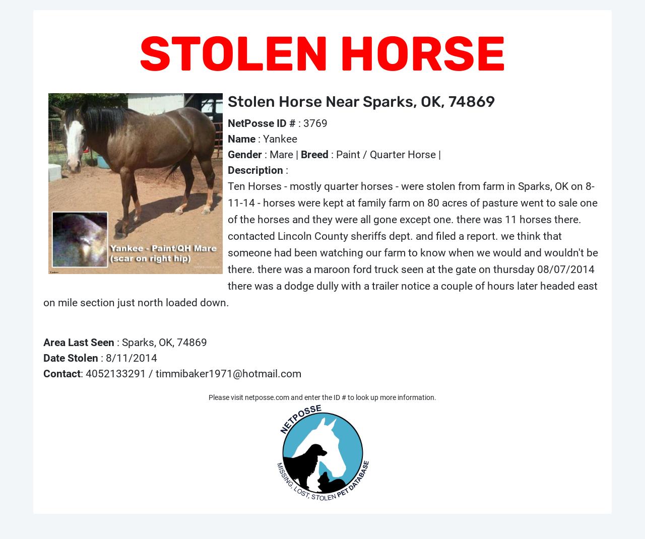 Description: Ten Horses - mostly quarter horses - were stolen from farm in Sparks, OK on 8-11-14 - horses were kept at family farm on 80 acres of pasture went to sale one of the horses and they were all gone except one. there was 11 horses there. contacted Lincoln County sheriffs dept. and filed a report. we think that someone had been watching our farm to know when we would and wouldn't be there. there was a maroon ford truck seen at the gate on thursday 08/07/2014 there was a dodge dully with a trailer notice a couple of hours later headed east on mile section just north loaded down.