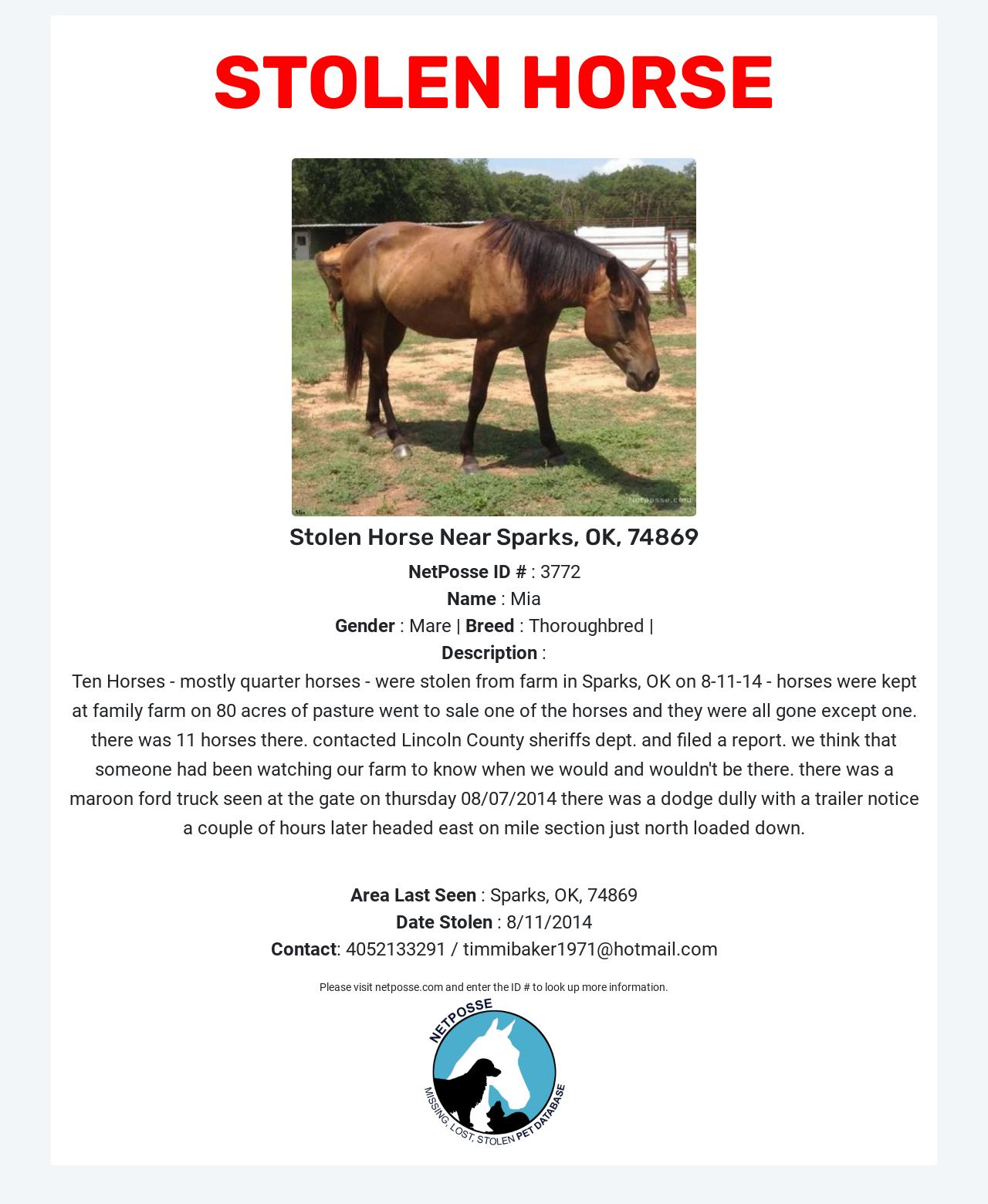 Description: Ten Horses - mostly quarter horses - were stolen from farm in Sparks, OK on 8-11-14 - horses were kept at family farm on 80 acres of pasture went to sale one of the horses and they were all gone except one. there was 11 horses there. contacted Lincoln County sheriffs dept. and filed a report. we think that someone had been watching our farm to know when we would and wouldn't be there. there was a maroon ford truck seen at the gate on thursday 08/07/2014 there was a dodge dully with a trailer notice a couple of hours later headed east on mile section just north loaded down.