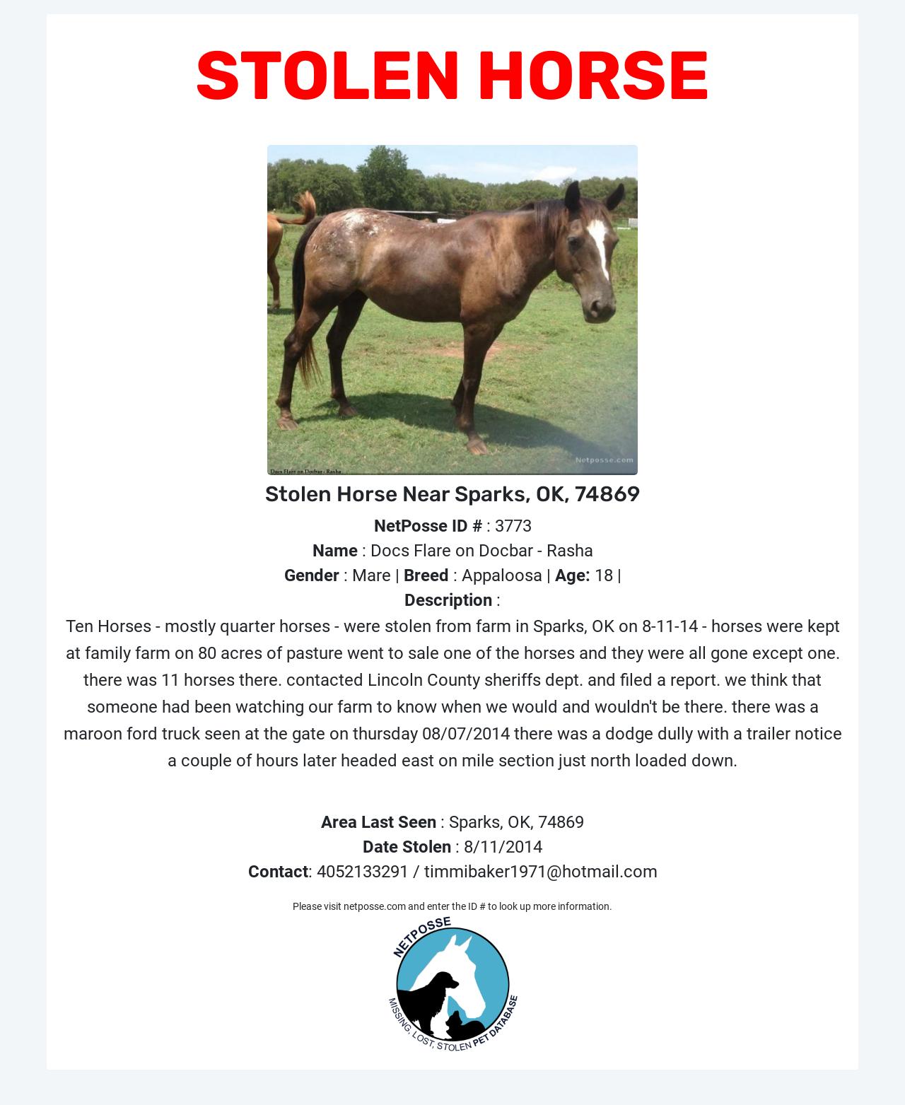Description: Ten Horses - mostly quarter horses - were stolen from farm in Sparks, OK on 8-11-14 - horses were kept at family farm on 80 acres of pasture went to sale one of the horses and they were all gone except one. there was 11 horses there. contacted Lincoln County sheriffs dept. and filed a report. we think that someone had been watching our farm to know when we would and wouldn't be there. there was a maroon ford truck seen at the gate on thursday 08/07/2014 there was a dodge dully with a trailer notice a couple of hours later headed east on mile section just north loaded down.