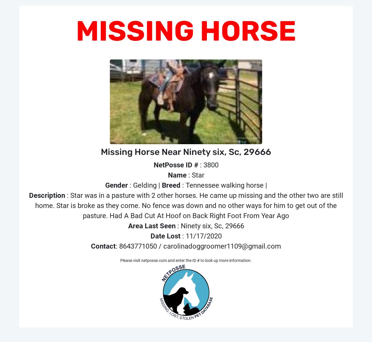 Description: Star was in a pasture with 2 other horses. He came up missing and the other two are still home. Star is broke as they come. No fence was down and no other ways for him to get out of the pasture. Had A Bad Cut At Hoof on Back Right Foot From Year Ago