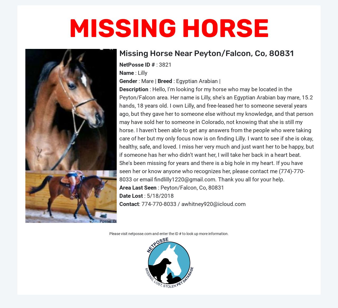Description: Hello, I'm looking for my horse who may be located in the Peyton/Falcon area. Her name is Lilly, she's an Egyptian Arabian bay mare, 15.2 hands, 18 years old. I own Lilly, and free-leased her to someone several years ago, but they gave her to someone else without my knowledge, and that person may have sold her to someone in Colorado, not knowing that she is still my horse. I haven't been able to get any answers from the people who were taking care of her but my only focus now is on finding Lilly. I want to see if she is okay, healthy, safe, and loved. I miss her very much and just want her to be happy, but if someone has her who didn't want her, I will take her back in a heart beat. She's been missing for years and there is a big hole in my heart.