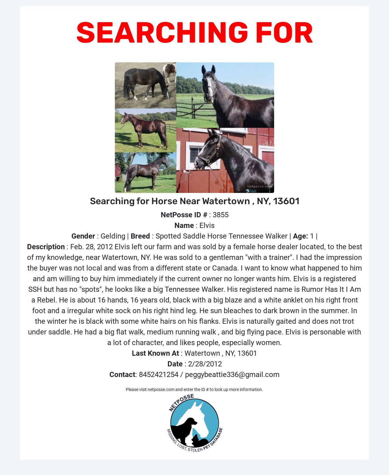 Description: Feb. 28, 2012 Elvis left our farm and was sold by a female horse dealer located, to the best of my knowledge, near Watertown, NY. He was sold to a gentleman "with a trainer". I had the impression the buyer was not local and was from a different state or Canada. I want to know what happened to him and am willing to buy him immediately if the current owner no longer wants him. Elvis is a registered SSH but has no "spots", he looks like a big Tennessee Walker. His registered name is Rumor Has It I Am a Rebel. He is about 16 hands, 20 years old, black with a big blaze and a white anklet on his right front foot and a irregular white sock on his right hind leg. He sun bleaches to dark brown in the summer. In the winter he is black with some white hairs on his flanks. Elvis is personable with a lot of character, and likes people, especially women. I took care of him for several years and want to know he is OK and would be happy to give him a retirement home. $1000 reward for recovery.
