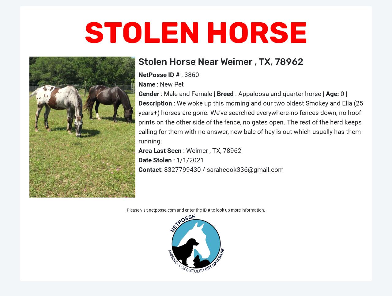 Description: We woke up this morning and our two oldest Smokey and Ella (25 years+) horses are gone. We’ve searched everywhere-no fences down, no hoof prints on the other side of the fence, no gates open. The rest of the herd keeps calling for them with no answer, new bale of hay is out which usually has them running.