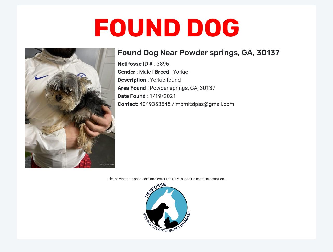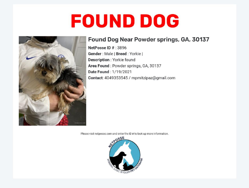 Gender: Male Species: Dog Breed: Yorkie Description: Yorkie found Area Found: Powder springs, GA, 30137 Date Found: 1/19/2021 Contact / Submit Tip