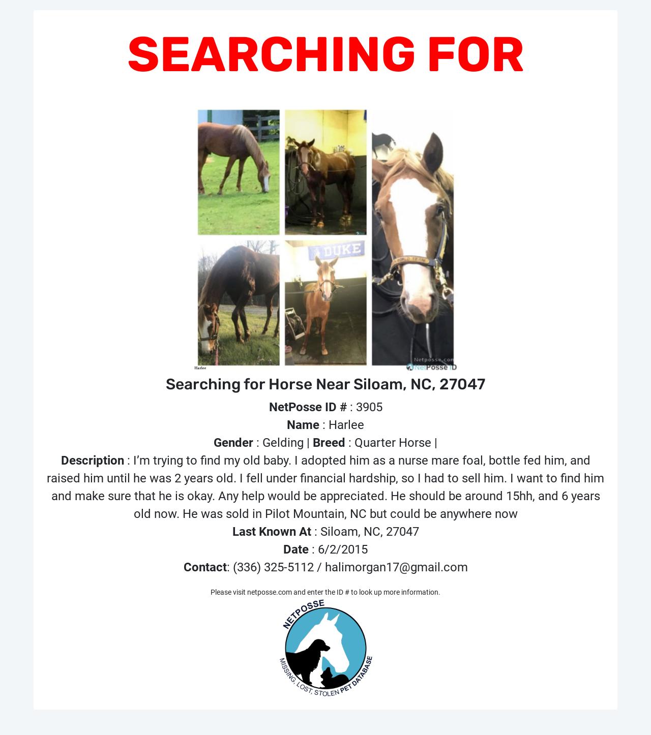 Description: I’m trying to find my old baby. I adopted him as a nurse mare foal, bottle fed him, and raised him until he was 2 years old. I fell under financial hardship, so I had to sell him. I want to find him and make sure that he is okay. Any help would be appreciated. He should be around 15hh, and 6 years old now. He was sold in Pilot Mountain, NC but could be anywhere now