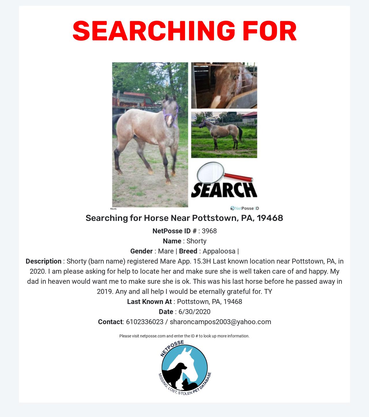 Description: Shorty was given to me before my father passed away in 2019. She is a registered Appaloosa, however I do not remember her registered name. My “stepmother” sold her to a horse dealer near Pottstown, PA , after I asked my stepmother to buy her and she told me no! Two days after she told me I was not allowed to buy her, I went to my dads house to take care of her like I always did, and she was gone! Shorty was the last link I had with my dad, so much so while he was in hospice, he made me promise to not let anything happen to his saddle and my stepmom won’t even give me it. I’ve never had a bond with a horse like I did Shorty. I dream about her and my dad all the time. The day that the horse dealer took the horses, I went straight to his barn, within a few hours of him picking the horses up, and I pleaded and begged with him to let me buy her back. I know for a fact he only bought her for $700. I was told no, I already have a deposit on her. I said tell me who bought her and I will speak with the person. He said no. I am desperately begging for help to find her. I’m hoping she is still inPa, and has not been run thru New Holland, or at least that’s what I think.