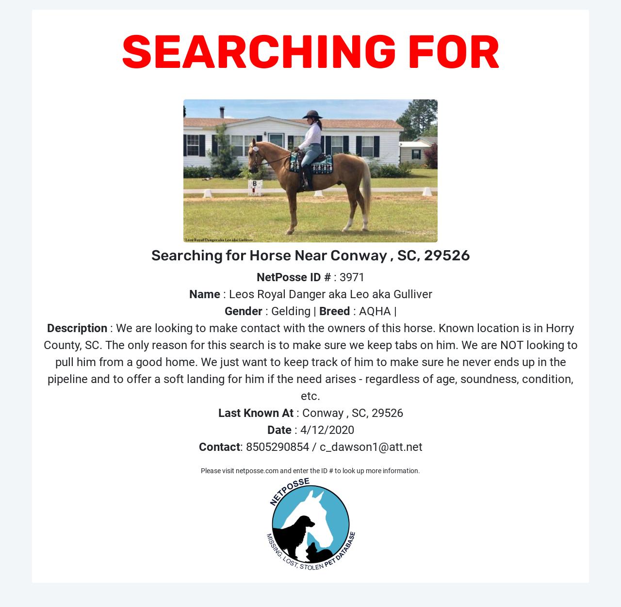 Description: We are looking to make contact with the owners of this horse. Known location is in Horry County, SC. We just want to keep track of him to make sure he never ends up in the pipeline and to offer a soft landing for him if the need arises. I also can give more in depth information about him such as show records, training, pictures, and medical history if the current owner gets in contact with us.