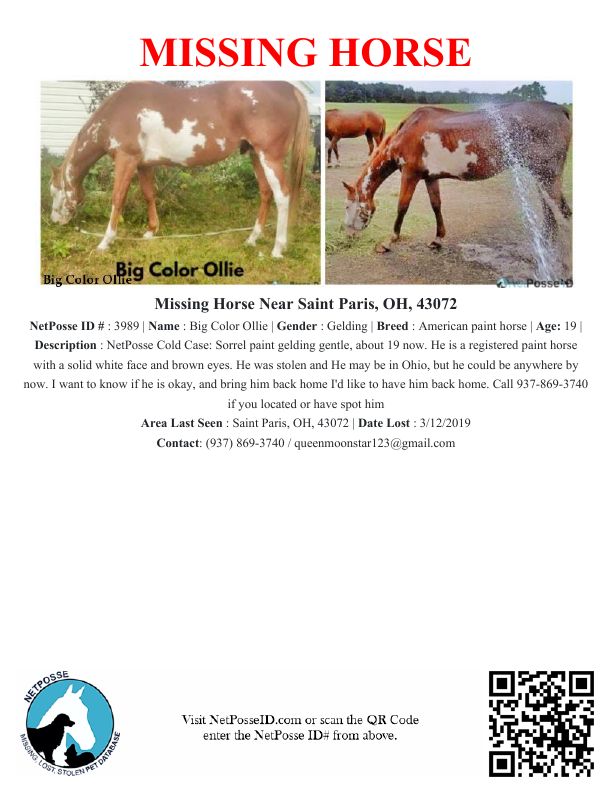 2023: I am still looking for a paint gelding he would be about 18 now I want to know where he is. He is a registered paint horse he has a solid white face and brown eyes anyone has any information, please message me. He should be around the Ohio area was his last known location he responds to Ollie his registration name is big color, Ollie. 9378693740 is a number you can reach. I will pick him up anywhere he is he was my heart horse and the last gift from my grandfather
