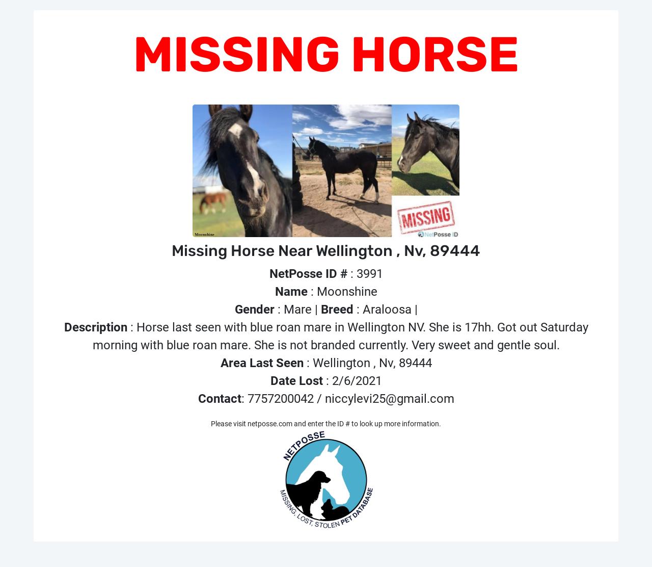 Description: Horse last seen with blue roan mare and two minis in Wellington NV area. She is 17hh and registered. She is not branded currently. Very sweet and gentle soul. Please reach out to me with any tips or information.