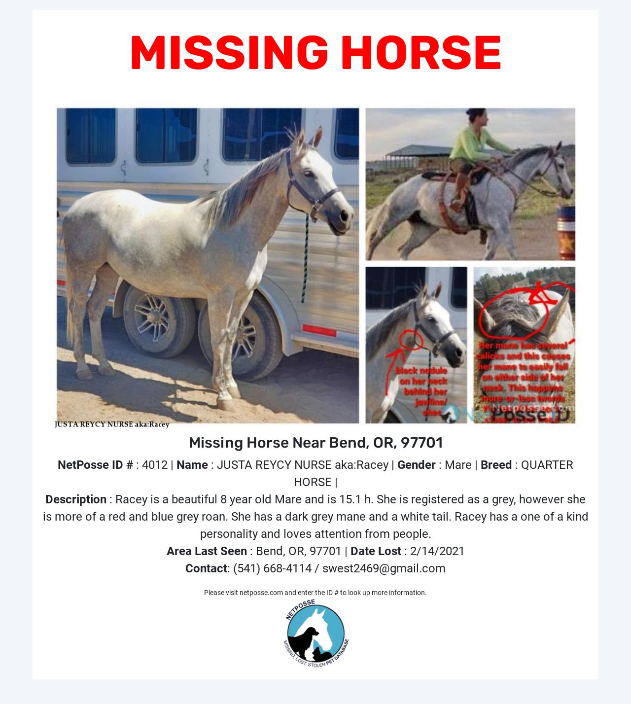 Horse Stolen from Bend boarding facility just days after physical altercation By NW Horse Report Staff - February 17, 2021 https://nwhorsereport.com/horse-stolen-from-bend-boarding-facility