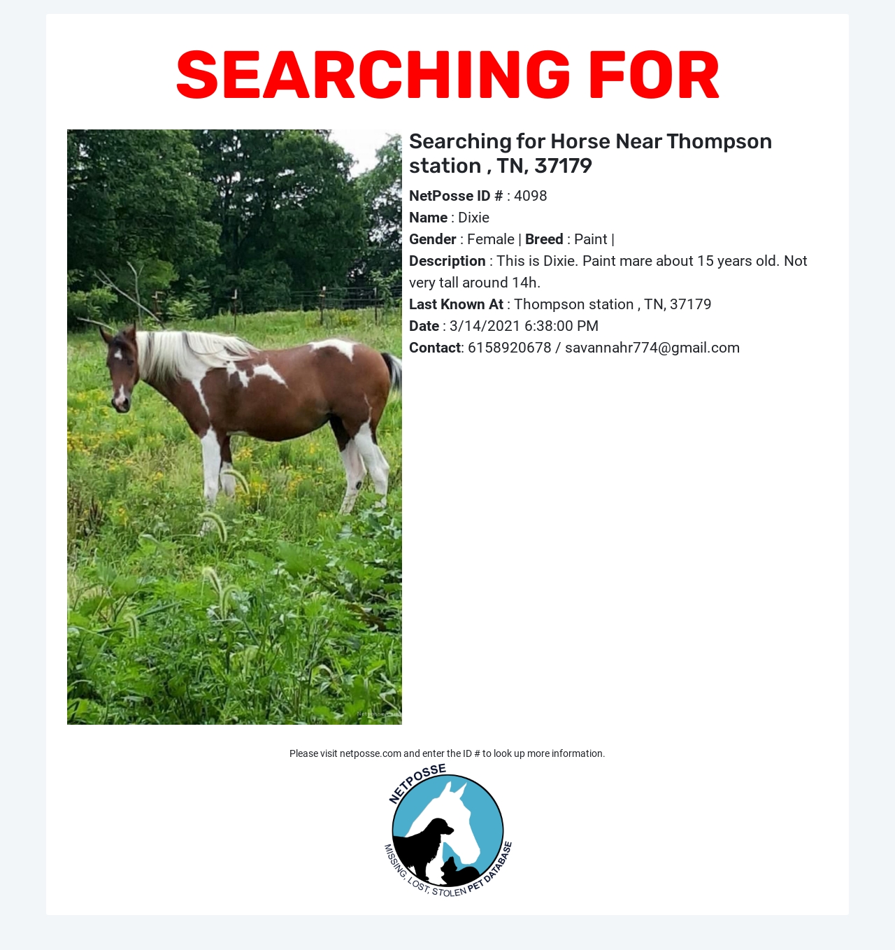 Description: I am looking my old horse I use to own. She was sold in 2016. Her last known whereabouts was Thompson Station,TN. She probably is around the age of 15. She wasn’t really tall. About 14h.