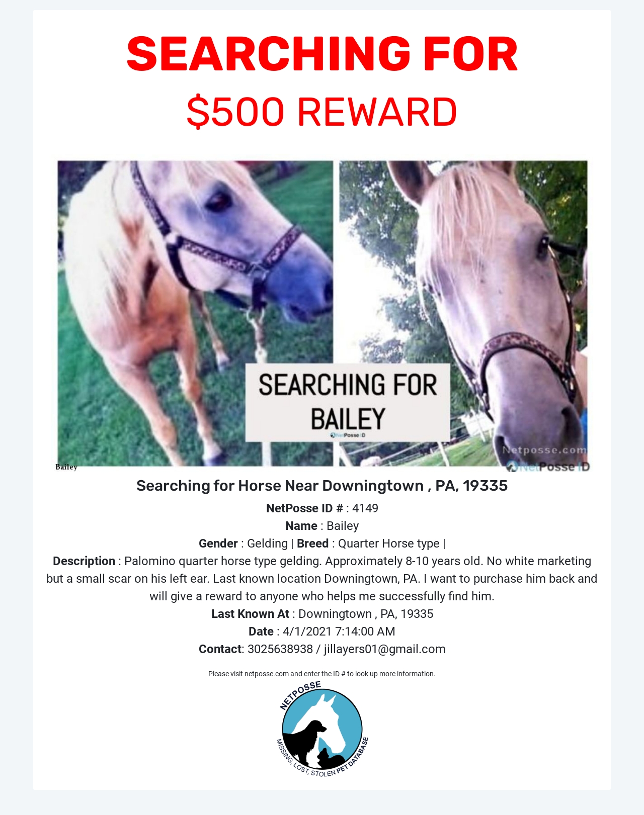 NetPosse Alert on Facebook: https://www.facebook.com/StolenHorseInternationalNetPosse/posts/4619701964710926