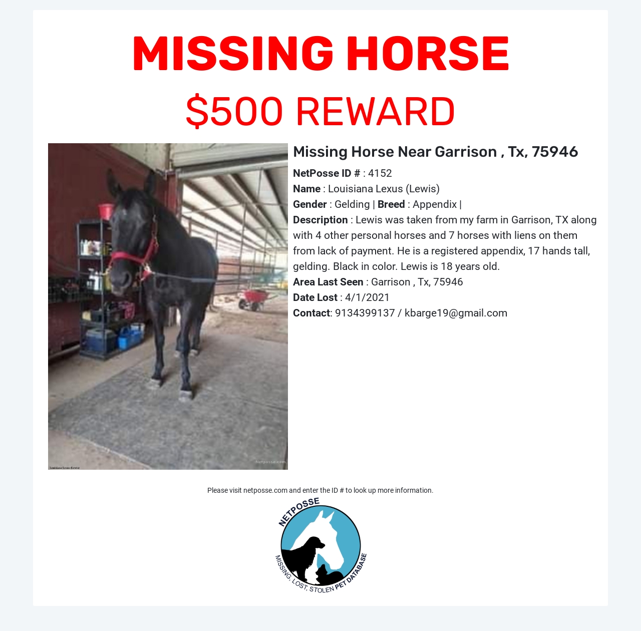 Description: Lewis along with 11 other horses were taken from my farm in Garrison, TX. 5 of the 12 horses are my personal horses. The other 7 have liens on them from lack of payment. A police report has been filed.