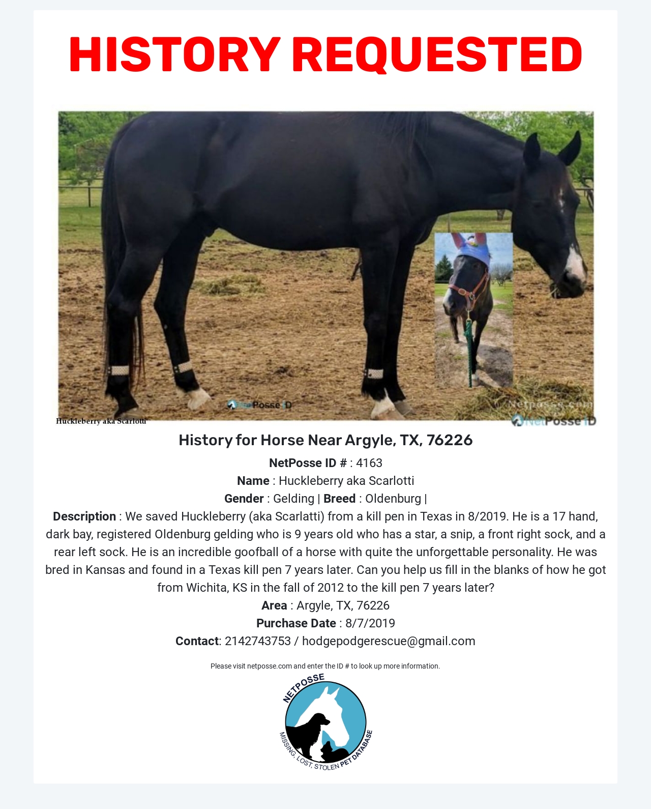**** Additional Update **** We hit a dead end with where Huck went from the breeder as they don't have records, didn't remember him and didn't think he was there long. We had someone reach out privately with some information but we're not sure it's the same horse. We aren't giving up and are tracking all leads to piece the rest of his story together. We owe a HUGE thank you to this community. We'll be updating on our farm page, HodgePodge Farm, from now on, so that other horses and humans get the attention on this page they so dearly deserve, as Huck is safe for the rest of his life with us. This is an amazing community and we are so, so grateful. ❤🐴❤ *** Update *** First let me please say a HUGE thank you to this community. We are so completely overwhelmed by the responses! I was hoping maybe 1 or 2 people would recognize him and be able to point us in a direction. I seriously underestimated the power of social media! Several folks have reached out to connect with me personally on Facebook and for that I am grateful, but I don't use FB personally very much. If you want to follow Huck's story, you will see all about him and his other rescued barnmates on our farm page, HodgePodge Farm. There's a big grey Percheron mare as our cover photo. We're also on Instagram if you prefer as hodgepodgerescue. Big shout out to Nicole who prompted his original breeder to contact me. We have been chatting all afternoon and I now know he went from her to a farm in Wichita, KS as a yearling in the fall of 2012. She lost track of him from there and was thrilled to learn about him today. If anyone has connections or knows of a Singletree Stables near Wichita, it appears that's where our next bread crumb may be. Also, she gave me this newborn pic of our boy to add here. *** We bought Huckleberry from a kill pen in Texas in August of 2019. We recently found that he has a microchip and were able trace that microchip to Germany and now have his lineage and his papers being transferred to us. He is a registered Oldenburg, original name, Scarlatti, born 11/5/2011. His sire was Soprano, who stood in Maryland and the name of his breeder on his papers appears to be from Kansas. We have tried to reach out to both but have been unsuccessful. This boy is 17 hands of gorgeous goofball, and we would like to put his story together, but are also worried that someone has been looking for him. We appreciate any help, tips, leads, etc., to help us piece together his story. We're not looking to rehome him, unless he was stolen or his original family(s) have been searching for him.