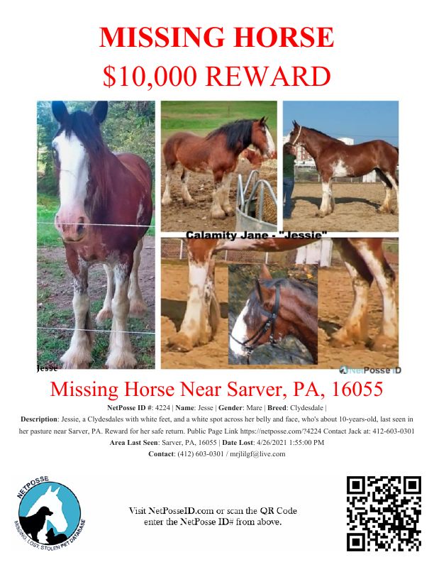 Jessie's Facebook Post: MISSING FROM PA - $2000 REWARD - Have you seen this big girl at horse auctions, kill pens, events, etc.? *NEW* Missing Horse Alert ~ Sarver, PA https://www.facebook.com/StolenHorseInternationalNetPosse/posts/4671829986164790