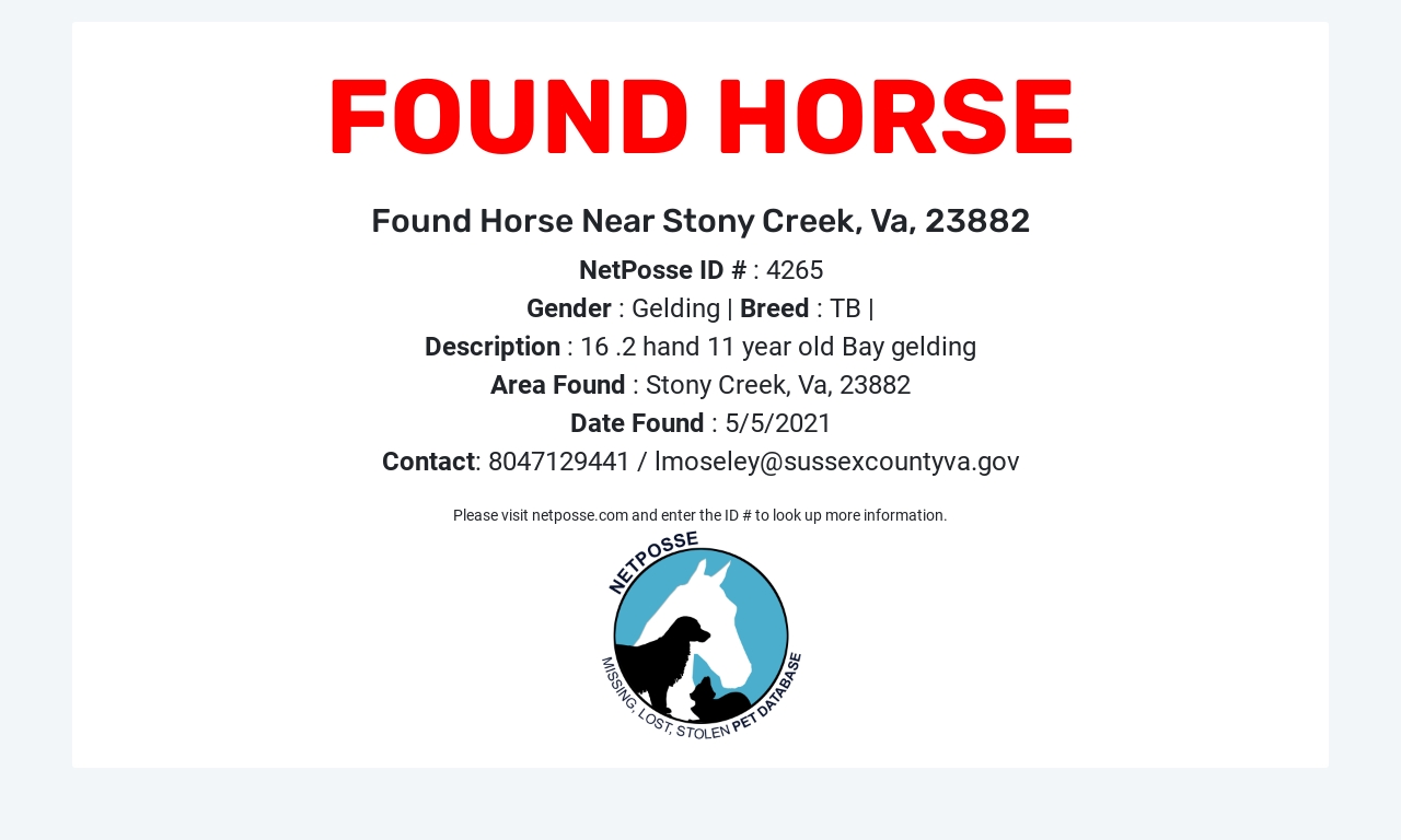 Gender: Gelding Species: Horse Breed: TB Description: Was in auto accident on 95 in Stony Creek Virginia Area Found: Stony Creek, Va, 23882 Date Found: 5/5/2021 Contact / Submit Tip