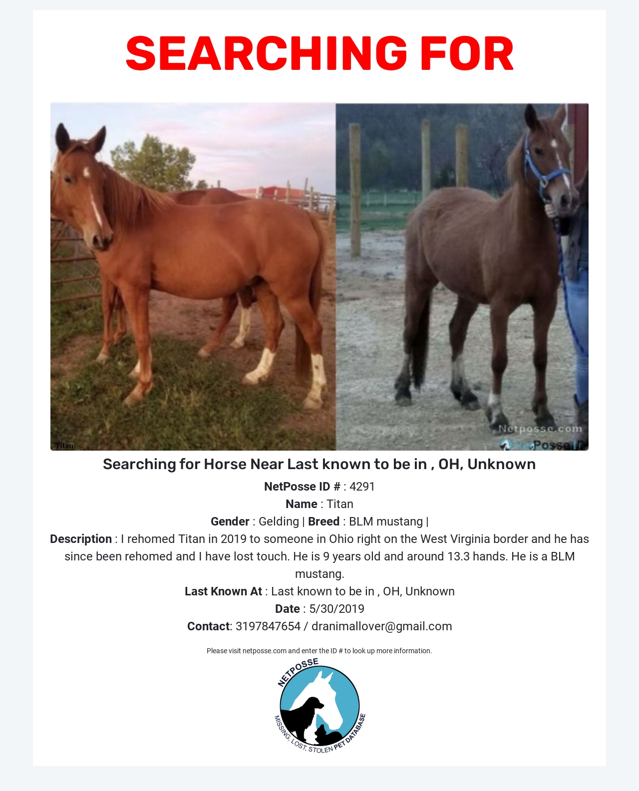 Description: I rehomed Titan in 2019 to someone in Ohio right on the West Virginia border and after that he was rehomed and I have since lost touch with him. He is 9 years old now and around 13.3 hands. He is a BLM mustang. I just had a really close bond with him and it crushes me everyday that I decided to rehome him. If anyone knows him or can give me information about where he is at I would really appreciate it.
