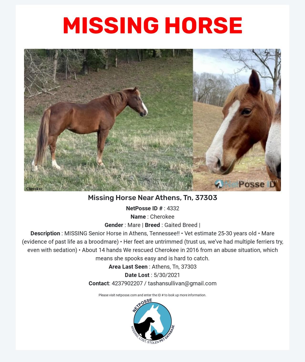 Description: MISSING Senior Horse in Athens, Tennessee!!