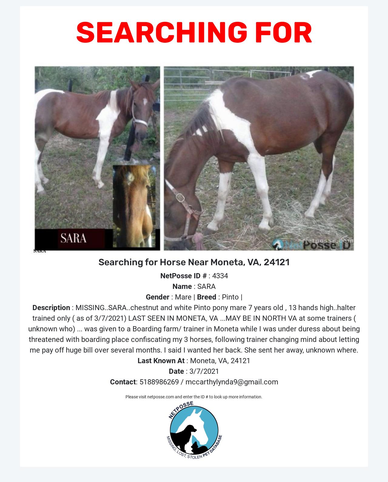 Description: MISSING..SARA..chestnut and white Pinto pony mare 7 years old, 13 hands high..halter trained only ( as of 3/7/2021) LAST SEEN IN MONETA, VA ...MAY BE IN NORTH VA at some trainers ( unknown who) ... was given to a Boarding farm/ trainer in Moneta while I was under duress about being threatened with boarding place confiscating my 3 horses, following trainer changing mind about letting me pay off huge bill over several months. I said I wanted her back. She sent her away, unknown where.