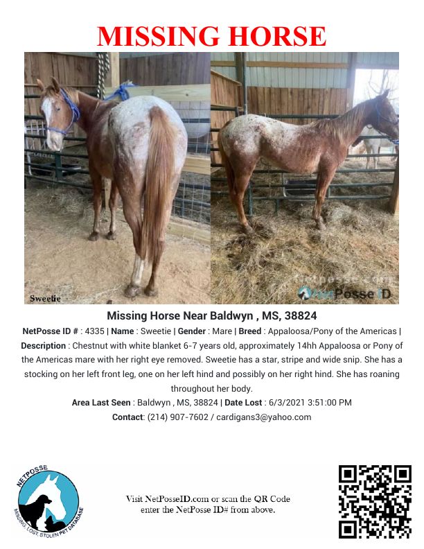 Description: On approximately February 6, 2021 I saw an Appaloosa mare named ‘Sweetie’ with a severe eye injury listed for sale on Facebook, the mare was in a ‘kill pen’ in MS. I contacted the poster about the mare and on February 11, 2021 I sent $600 via Venmo to buy the horse. I live in SC so I made arrangements for Sweetie to be trailered to an animal hospital in Baldwyn MS to have the eye treated. Sweetie arrived at the vet clinic on February 13, 2021. She was boarded at the vet clinic until March 16, 2021 when surgery was performed to remove the eye.