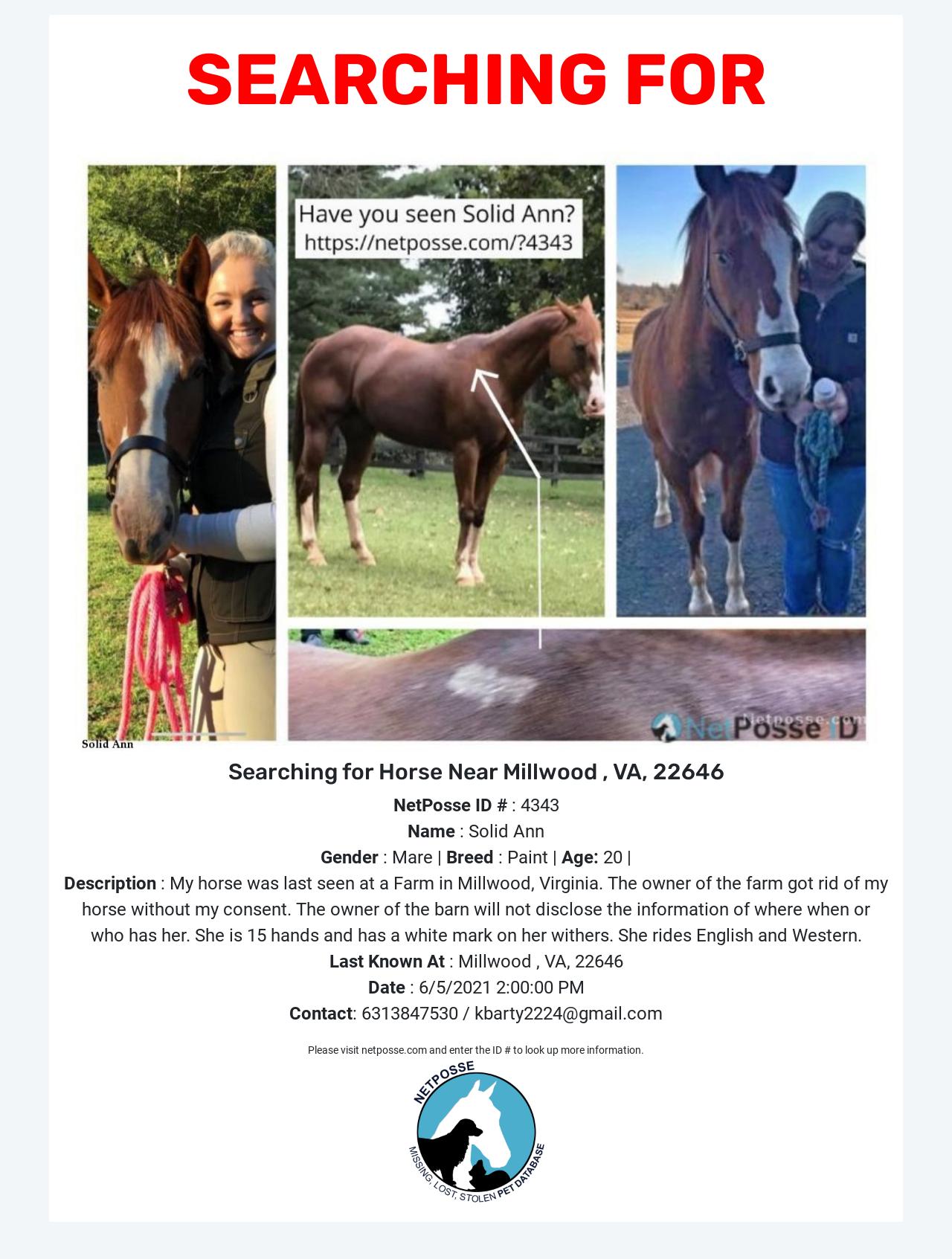 From Facebook Post: Teri Barty is with Kassandra Smith and Kevin Barty. June 15, 2021 · ANNIE IS HOME! 🙏 Thank you to everyone who has helped our family get Annie back. She is safe and with her family!!!! Once the State Police, Sheriffs and attorneys got involved, the owner the farm in Millwood Va. had my horse brought back to her farm yesterday. We know have here off that property and is safe! Still not sure where Annie has been we are overwhelmed with joy to have her back! Having a part of your family taken from you by someone is heartless, evil and sickening! Once again…… thank you for the 10’s of thousands of people who have helped us find our girl!!!!!!!! Prayers really do help!