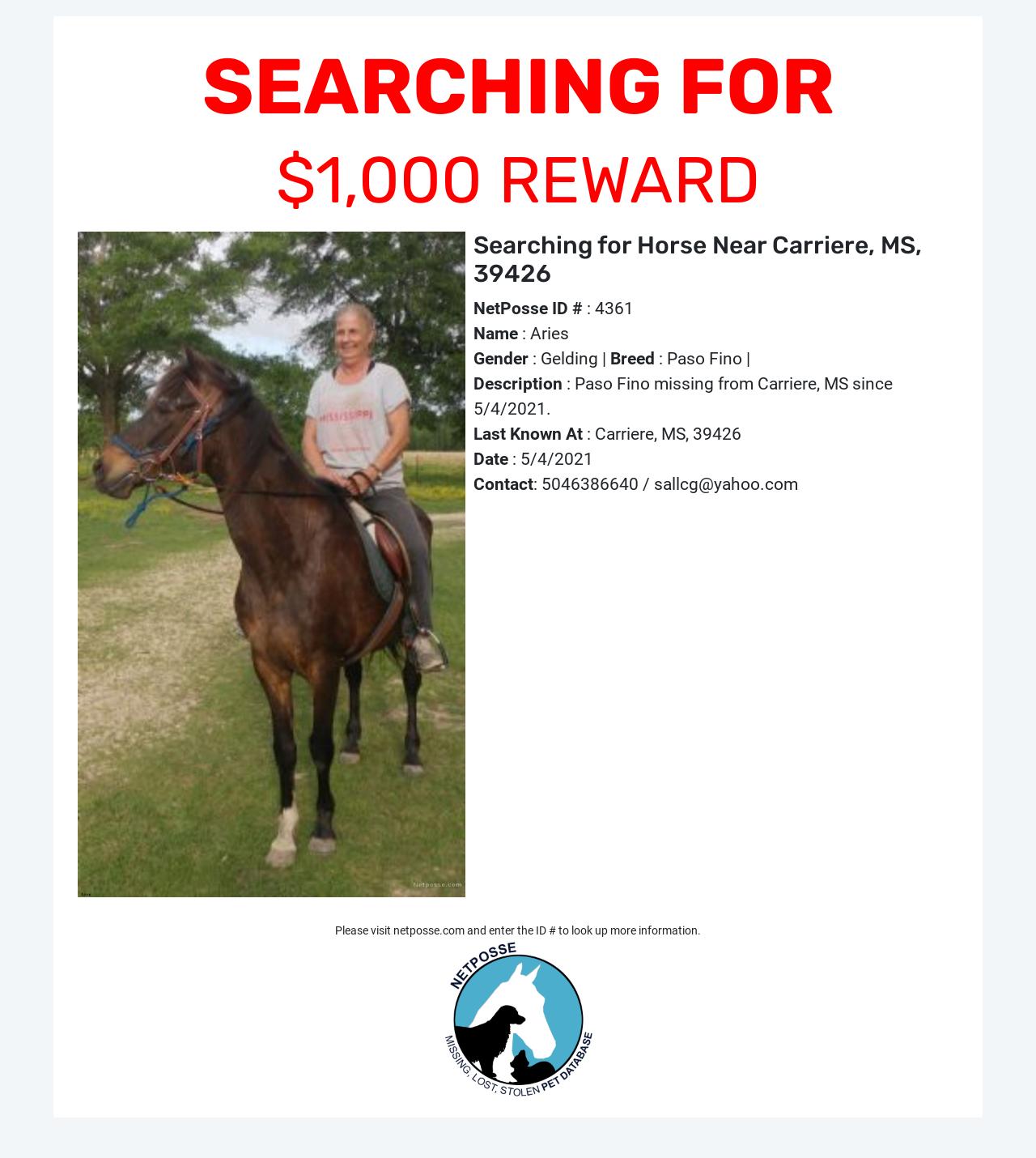 Description: Aries was adopted but went missing from a property with 19 other horses 2 days after arrival. All fences are intact, and a thorough search of the property resulted in no body recovery. A police report was filed, sales barns notified, but we have no leads.