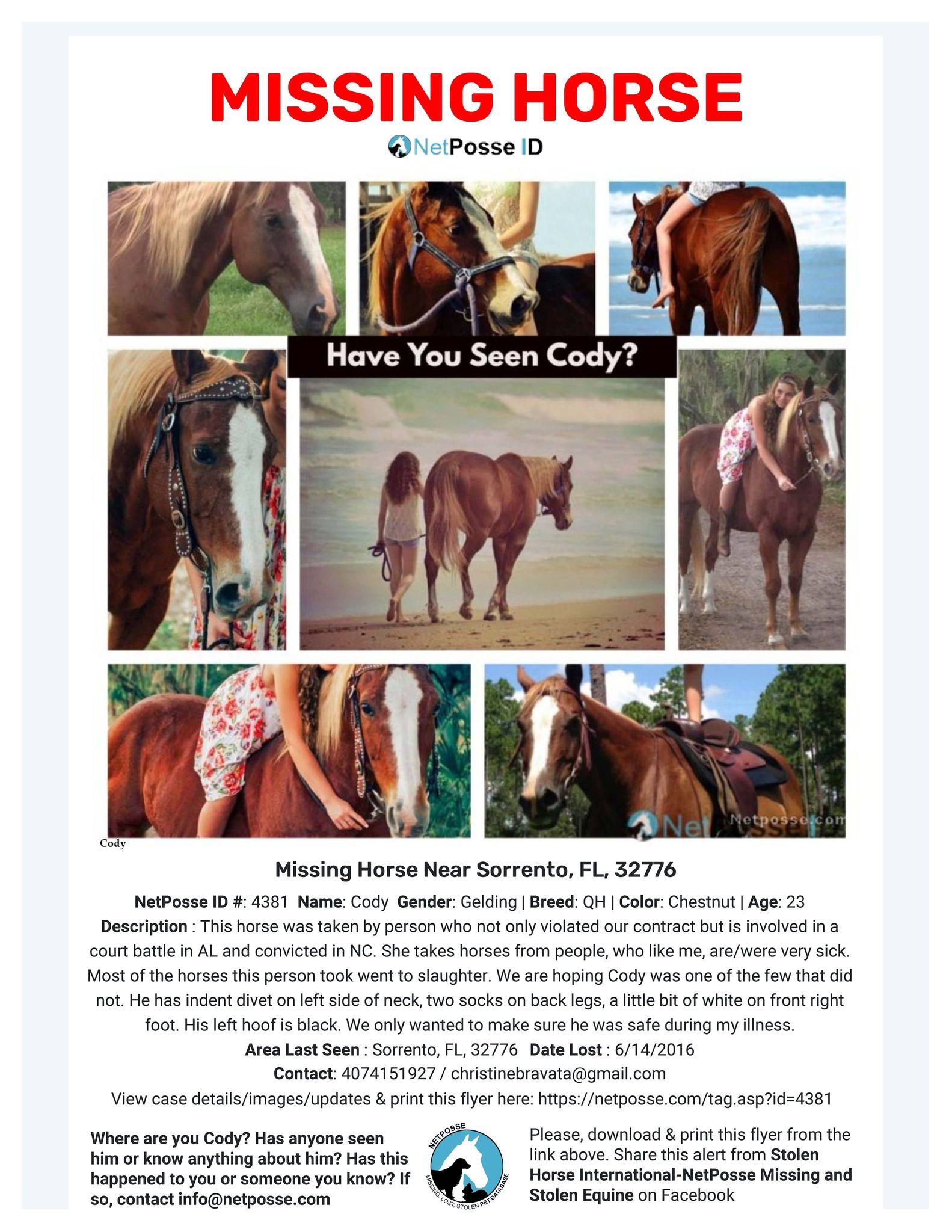 Description: MAKE SURE YOU READ THE UPDATES IN THE COMMENT SECTION AT THE BOTTOM OF THIS NETPOSSE REPORT: Has anyone on here sold or bought their horse from a girl named Mary Williams (not her real name) who was in Lawtey Florida in 2016? I now know her real name and that she has been arrested and convicted for doing the same thing to someone else in NC. There is a tremendous amount of information about her on Google. She was a vet student at Tuskegee University and has a current case in AL that is awaiting trial. In my opinion, she basically committed a 'civil theft' with my horse 4 years ago. We had a “signed contract” that she was just watching him while I went through cancer treatments. I am looking into the civil theft statutes in FL to see if that will help us any with prosecution now that I know her real name. Our horse Cody, a gelding with chrome would be 23 now. He was bred by Ted Sokel - a well-known QH cutting horse breeder in Ocala Fl. He is chestnut but can be a little reddish at times. He has an indent divet on his left side of his neck, two white socks on his back legs, a little bit of white on his right front foot, and his left hoof is black, not white.