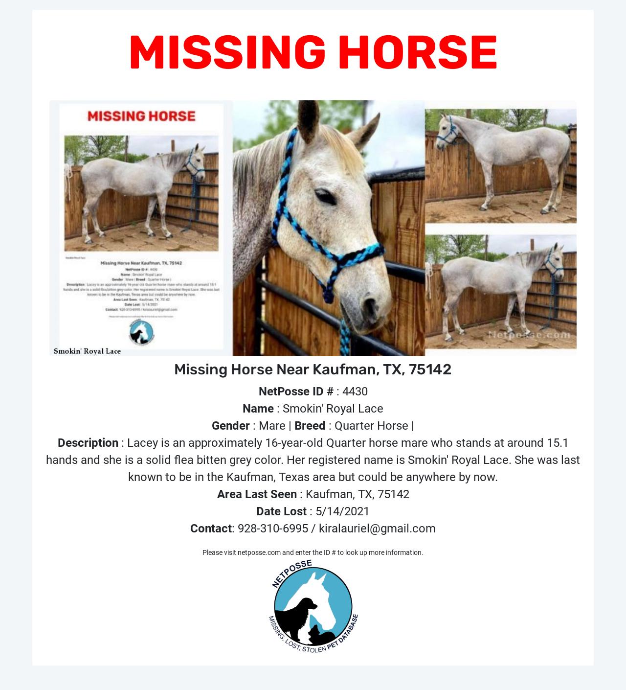 Description: This mare was purchased by me from and picked up at a kill pen to go to quarantine with someone I was paying for board and care/transport of said horse. She told me she died of pneumonia on May 14, 2021 and I asked for pictures of her body but she never sent me any. I do not believe she is dead, I think she must have sold her and tried to pass her off as dead. I desperately want to find her and I want to bring her home. Lacey is an approximately 16-year-old Quarter horse mare who stands at around 15.2 hands and she is a solid flea bitten grey color. Her registered name is Smokin' Royal Lace. She was last known to be in the Kaufman, Texas area but could be anywhere by now.