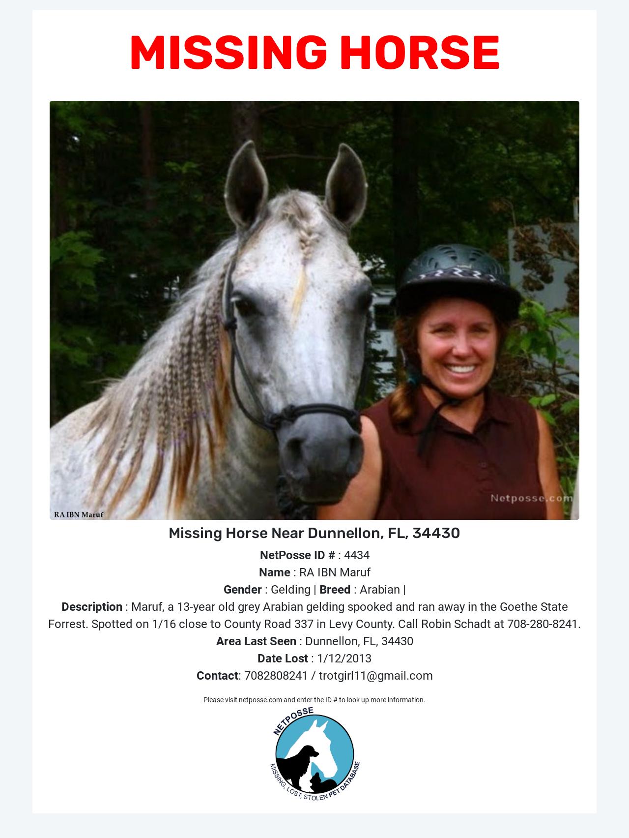 Ocala StarBanner News Story: Robin Schadt can’t remember exactly what spooked her 13-year-old Arabian named Maruf as she rode the gelding through the Goethe State Forest recently, but whatever it was scared him enough he ran into the dense woods and seemingly disappeared. https://www.ocala.com/article/LK/20130123/news/604137982/OS