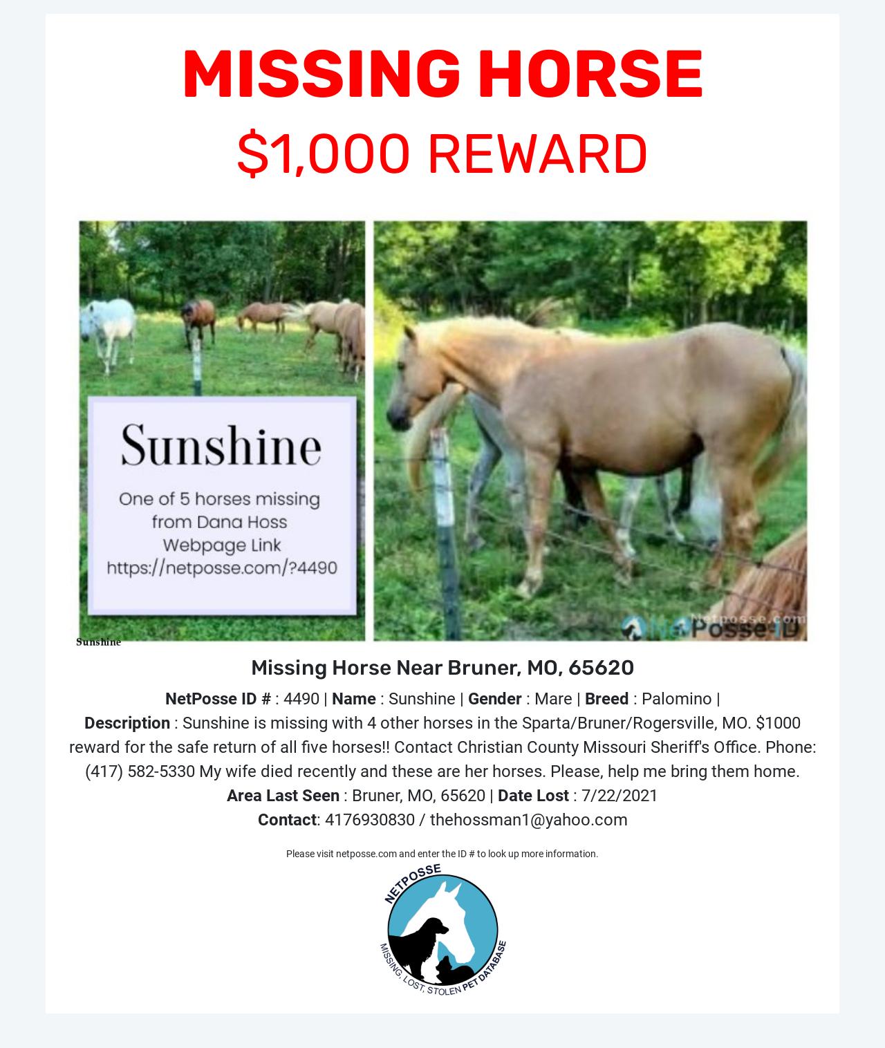 Description: We have 5 missing horses so please, anybody in the Sparta/Bruner/Rogersville, MO area, have you seen them? My wife just passed away on July 3rd and the horses were my wife’s pride and joy. Please spread this far and wide. I need them back desperately. We searched our 16-acre pasture, the neighbor's properties, the roads in a file mile radius and we cannot find them. We are not sure if they are missing or stolen, but a report has been made to law enforcement and the case is considered theft. I am offering a $1000 reward for the safe return of all five horses!! This has been reported to the Christian County Missouri Sheriff's Office. Phone: (417) 582-5330.