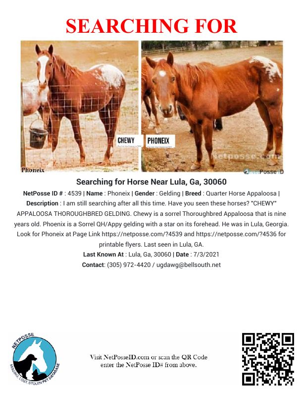 Description: I need help locating my Appaloosa geldings that were on a care lease. Chewy is a sorrel Thoroughbred Appaloosa that is nine years old. They were in Lula, Georgia. A woman was going to do some training with him and utilize him for her lesson program. The place she has been staying has been put up for sale, and she has sold off horses and is supposedly moving to Florida. The horses should have been returned to me if she could no longer use or care for them. She will not answer her phone, text, or message. She is young, and I am trying to allow her to return the horses. I want my horses returned. If anyone has seen them or knows their whereabouts, please PM me. I so appreciate any help in getting my horses returned. They were last seen in Lula, Georgia, in the possession of 2 people. They were using them for a lesson program. They abandoned the property they were on and sold the horses.